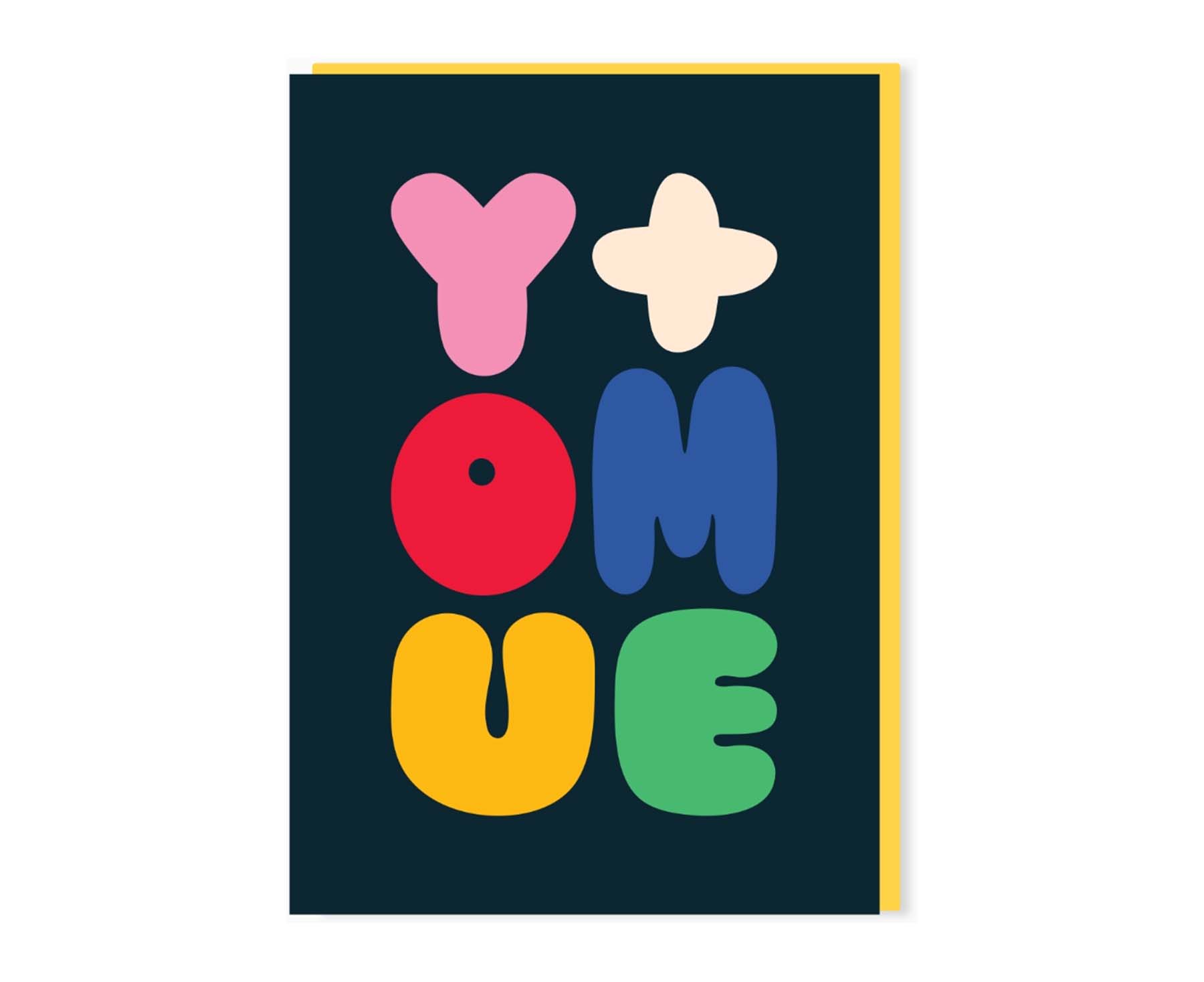 Featuring big bold and colourful typography saying 'You + Me', this makes the perfect anniversary card, valentine's card or a card to remind someone how much they mean to you any day of the year. It's one of many colourful, playful and often cheeky cards by Brighton based Stoats & Weasels.