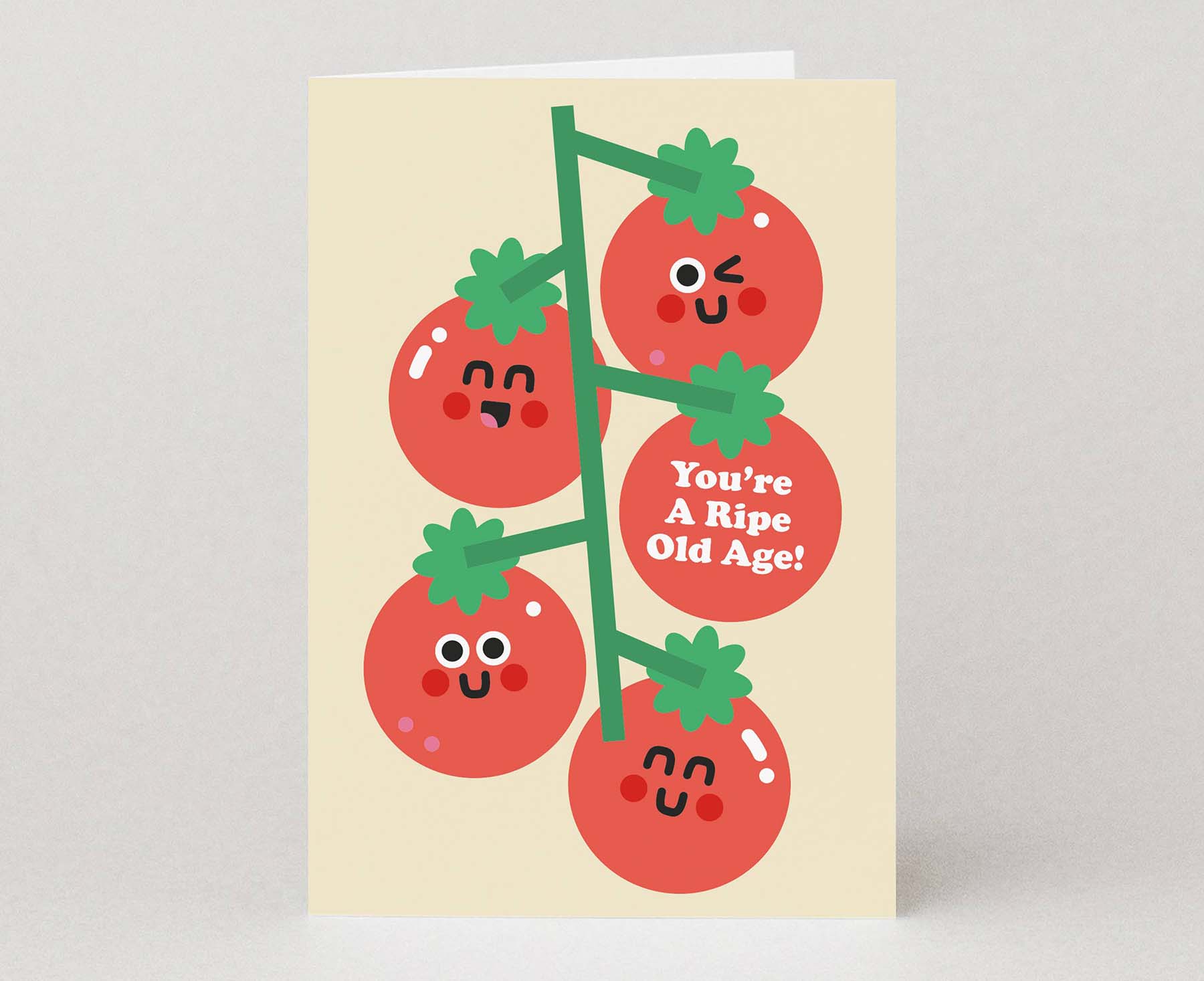 This fun birthday card from Studio Boketto features a smiling bunch of tomatoes with the caption 'You're a Ripe Old Age' making in the perfect birthday card for anyone who needs reminding that they just get better with age!